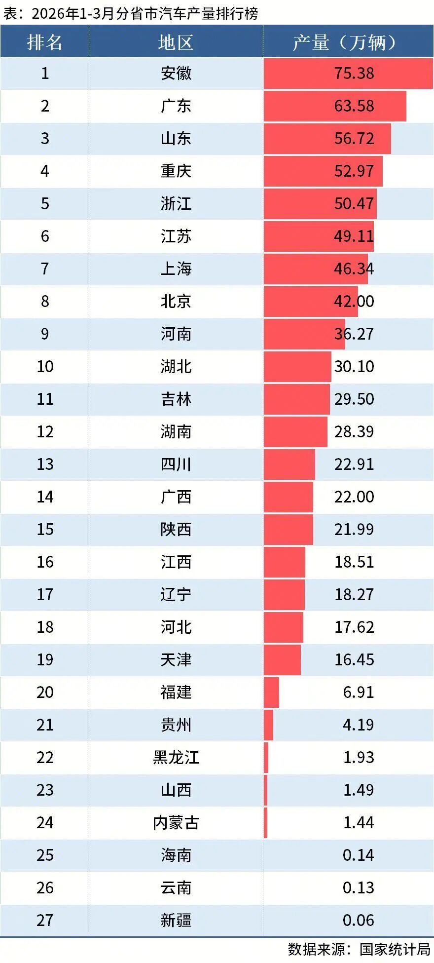 今年一季度,陕西汽车产量为21.99万辆,相比2025年一季度的45.25万辆下降超过50%,全国省份产量排名也从去年一季度的第6位下降到第15位。